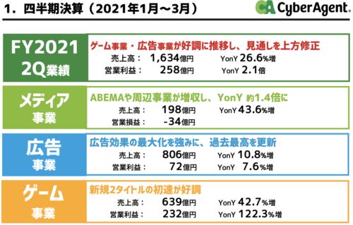 2021年度Q2決算 サイバーエージェントの2021年度第2四半期決算が発表された。 売上が前年同期比プラス26.6%、営業利益はプラス110%と記録的な数字となった。新作ゲームが大ヒットした影響だ。 細かくみていきたいと思います。 2021年度Q2決算 ゲーム事業 広…