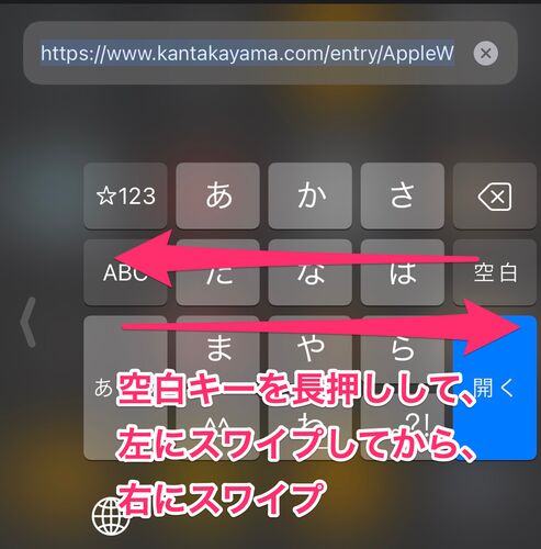 カーソルを動かす iPhoneのキーボードを表示しているときに、「空白」キーを長押しすると、カーソルを自由に動かせるのを知っている人は多いと思う。 しかし、日本語かなボードだと「空白」キーが右端にあるので、左側には移動できるけど、右側に移動できる…