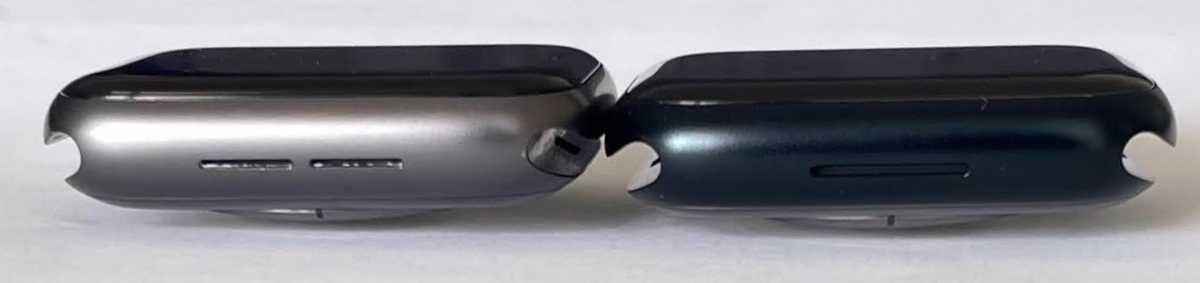 右側面。Digital Crownも色味が異なる。series 8の方が統一感ある。