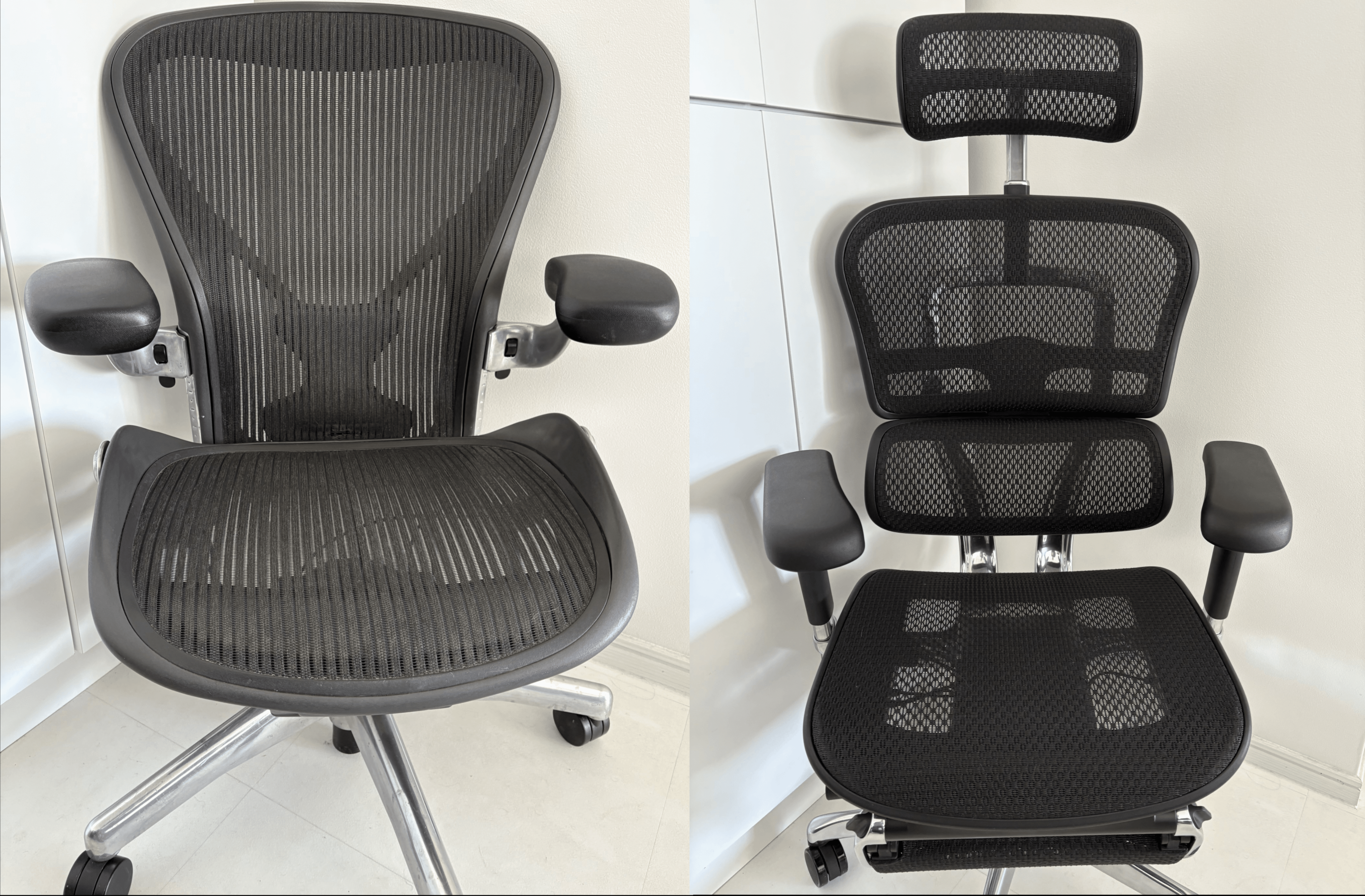 比べると、ずいぶん形が違いますね。エルゴヒューマンはヘッドレストとオットマンがついています。