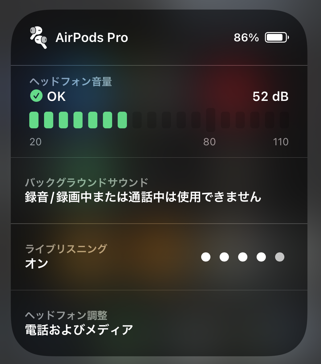 「ライブリスニング」をオンにすると、取り込んでいる音量がわかる。 「ライブリスニング」に並ぶ●も、取り込んだ音量を表している。