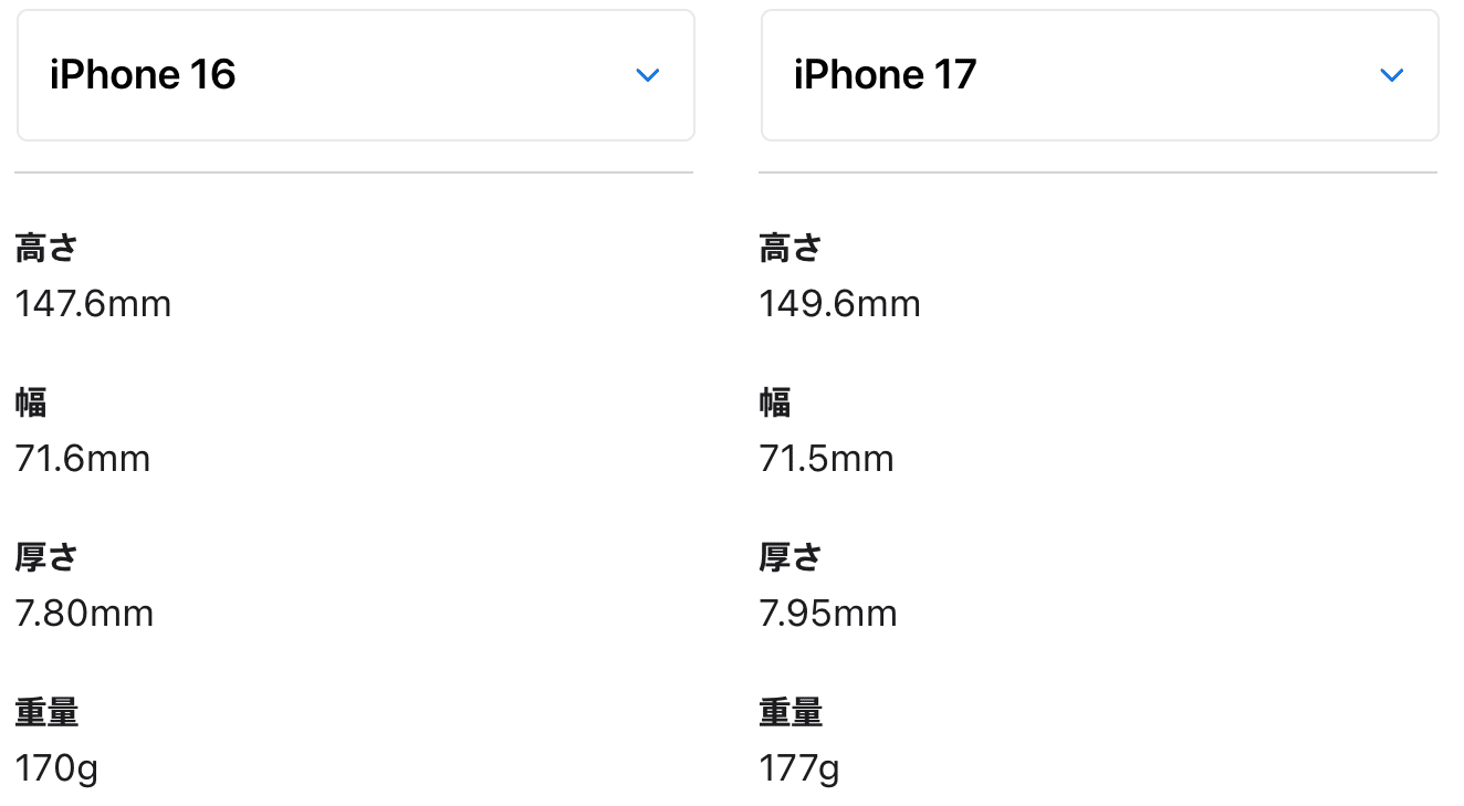 残るはiPhone 17とiPhone Airです。薄くて革新的なスタイルをしたiPhone Airには惹かれましたが、触ってみると、厚さはなくてもiPhone 16より幅が広いので、片手操作が厳しかったです。