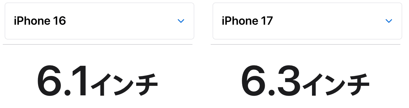 本体サイズはほぼ変わらなくても、iPhone 17のディスプレイサイズは0.2インチ大きいです。ベゼルが細く、少しだけ高さがあることが影響しています。
