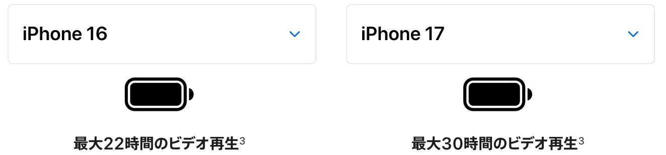 Appleの説明では、iPhone 17は最大30時間のビデオ再生が可能になったそうです。iPhone 16は最大22時間なので、スペック上はかなり改善しています。SIMカードスロットがなくなったことで、バッテリーが増量されたことが大きく影響しています。