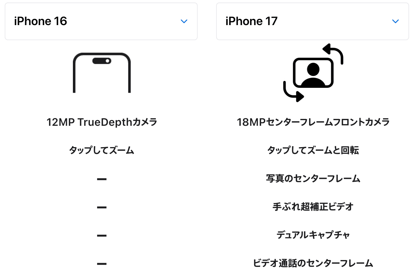 iPhone 17からフロントカメラが改善されています。画素数が増えて、センサー形状が正方形になったことで、縦向きのiPhoneで自撮り撮影しても横長の写真を残すことができるようになりました。